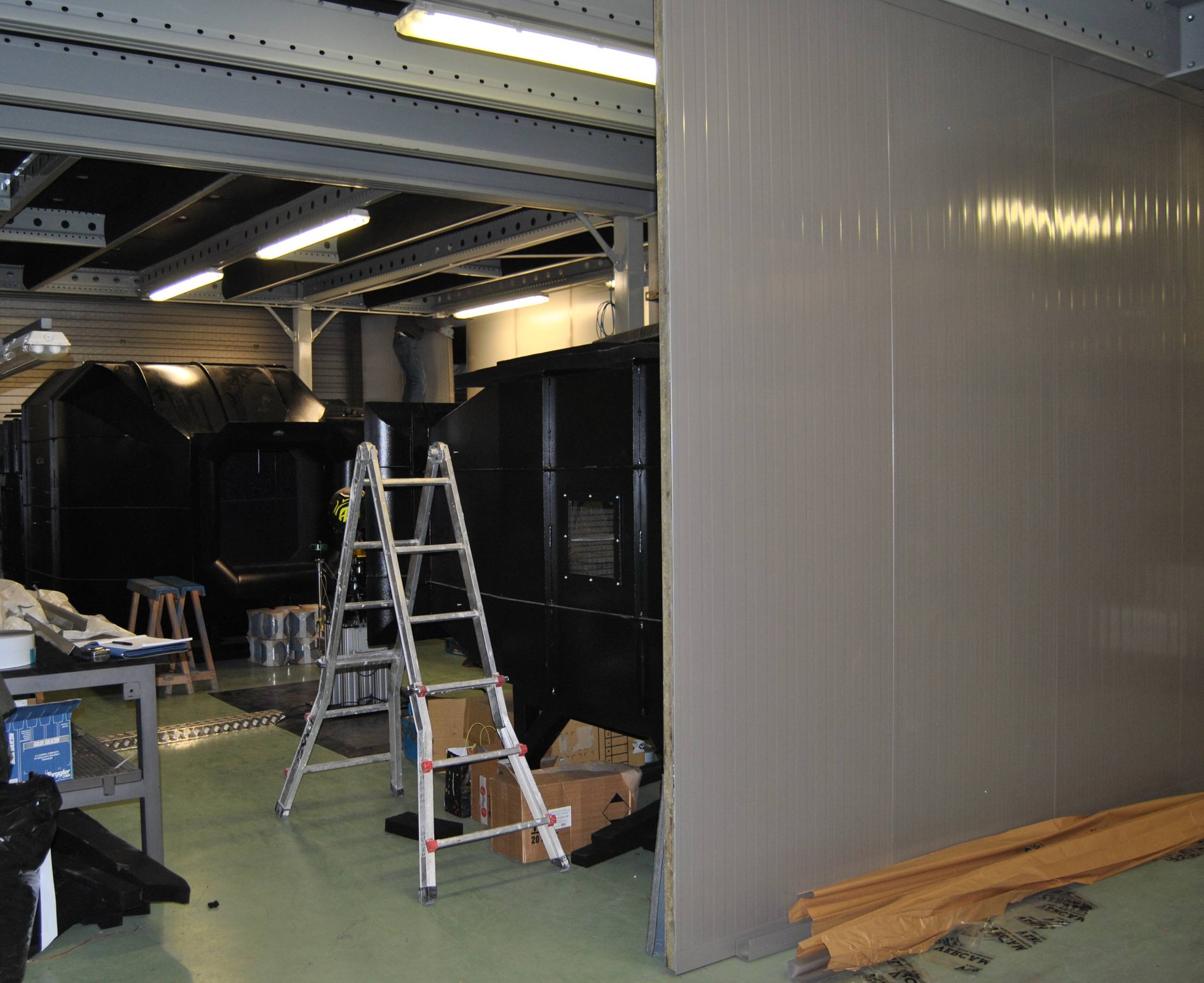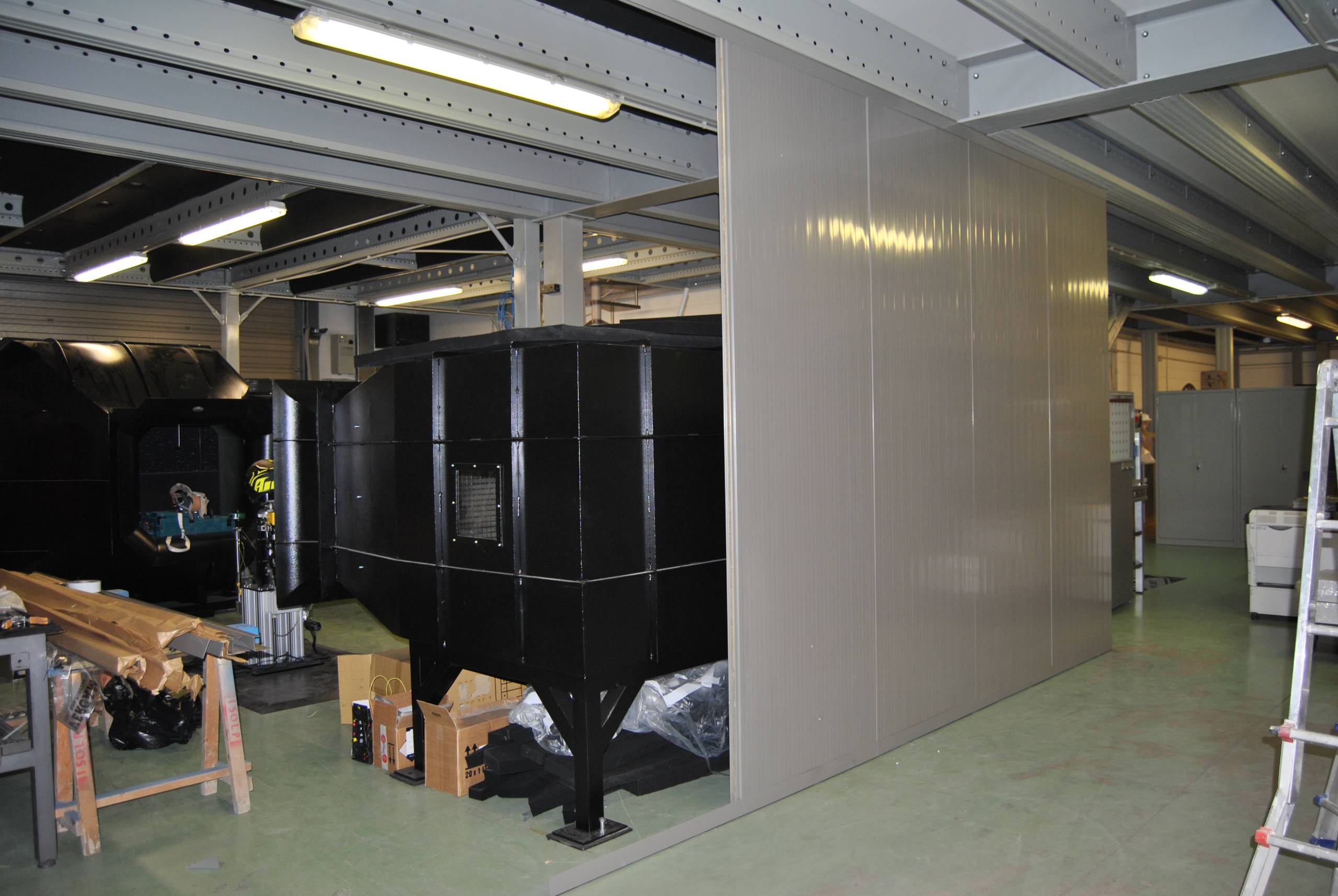 All’interno della stanza insonorizzata, in prossimità dei condotti di emissione ed immissione dell’aria, è stato posizionato un ulteriore box, realizzato con la struttura ISOLP standard in alluminio pressofuso, alla quale sono state installate due porte scorrevoli in vetri stratificati acustici per consentirne l’accesso. A terra è stata posizionata una pedana in alluminio mandorlato sagomato mentre per la parte superiore e verticale del box sono stati inseriti dei filtri di diverso spessore e capacità filtrante con struttura in alluminio necessari ad una corretta dispersione dell’aria verso l’esterno della cabina.