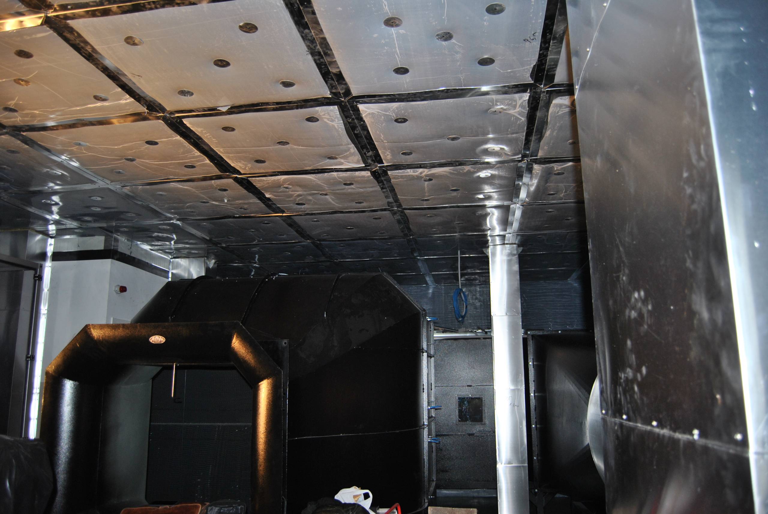 La parte interna della struttura è stata ulteriormente rivestita da pannelli multistrato composti da materiali fonoassorbenti e fonoimpedenti con uno spessore di circa 35/40mm l’uno e in ultimo pannelli di fibra di poliestere di circa 70 mm di spessore geometricamente smussati in modo da incrementare e migliorare l’assorbimento del rumore, oltre che creare un piacevole impatto visivo.